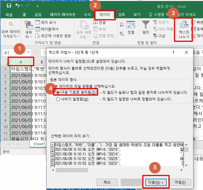 - 구분 기호로 분리됨 - 구분기호 선택 - 마침