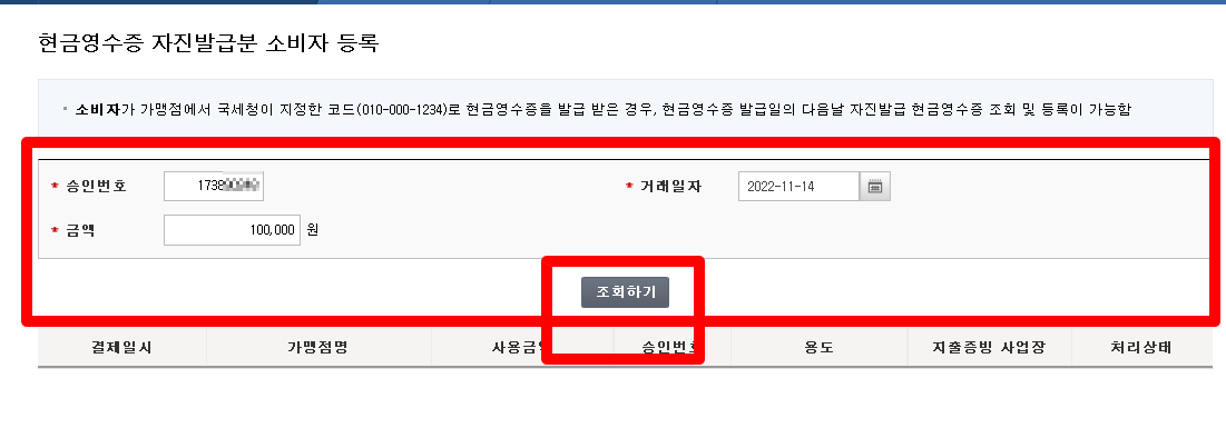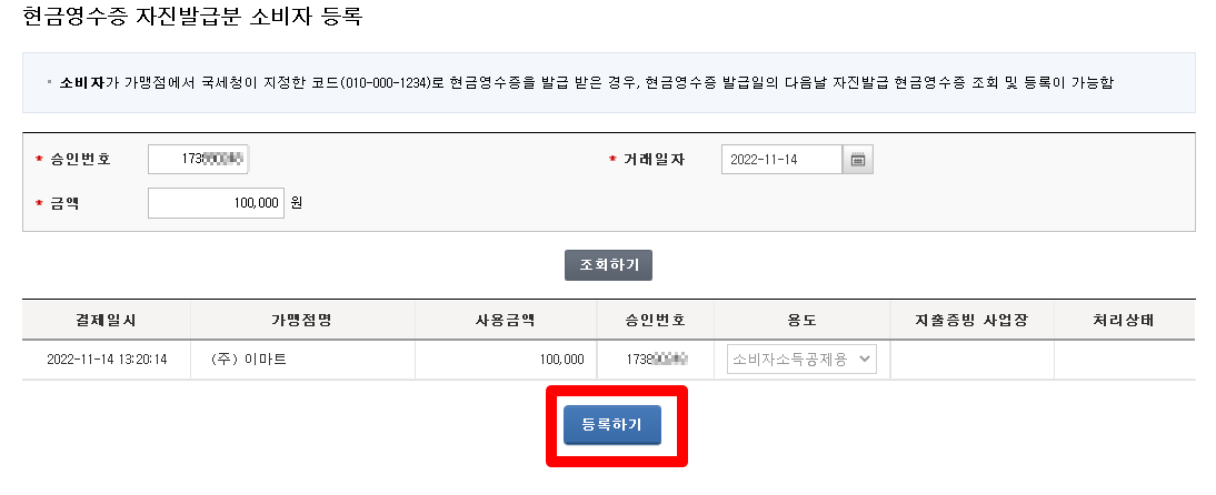 3) 승인번호, 거래일자, 금액을 모두 입력 - [조회하기] - [등록하기]