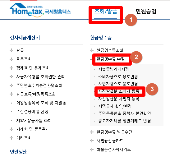2) [조회/발급] - [현금영수증] - [현금영수증 수정] - [자진발급분 소비자 등록]