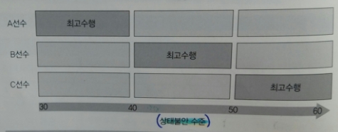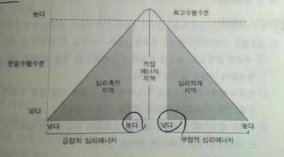 - 최고 수행 수준을 보일 수 있는 적정 심리 에너지 지역이 있다.
