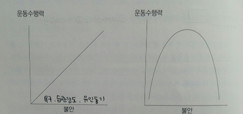 - 운동수행의 결과는 불안의 정도, 각성수준에 비례하여 증가한다는 이론