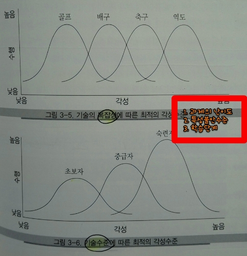 - 또한 개인의 수준에 따라 적정 수준에 차이가 있는데, 초보자의 최적 각성 수준은 숙련자의 각성 수준보다 매우 낮아야 한다.