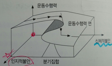 - 인지불안이 커짐에 따라 각성이 적정수준을 넘게 되면 어느 점에서 격변이 일어난다