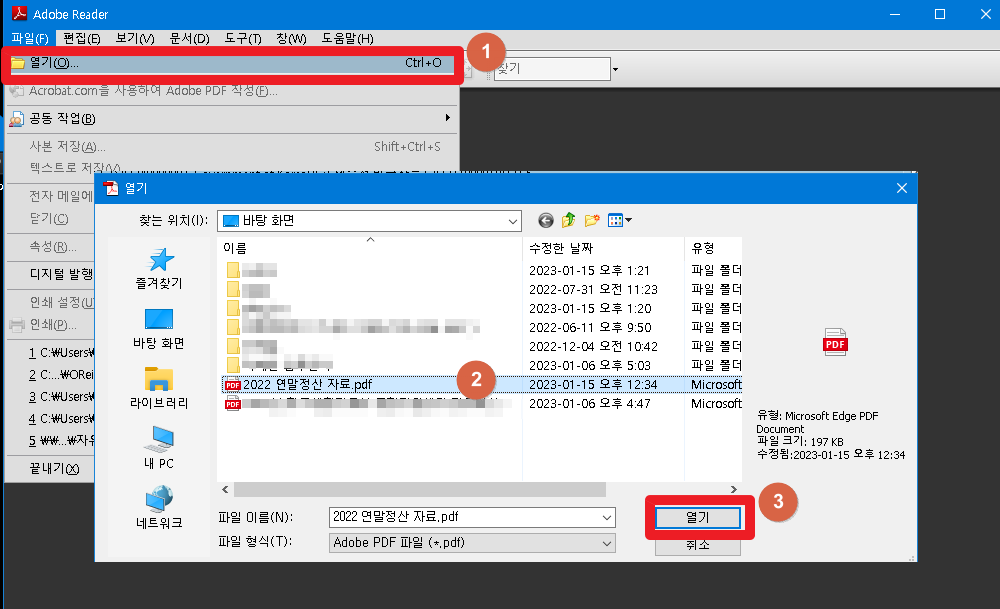 2) 1번째로 다운로드 받은 Adobe Acrobat Reader 를 들어간 후 열기로 파일을 불러오면