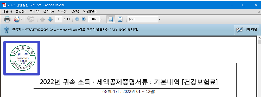 미검증이었던 PDF 파일이 진본으로 바뀌게 된다. 이후 인쇄하여 제출하면 끝!