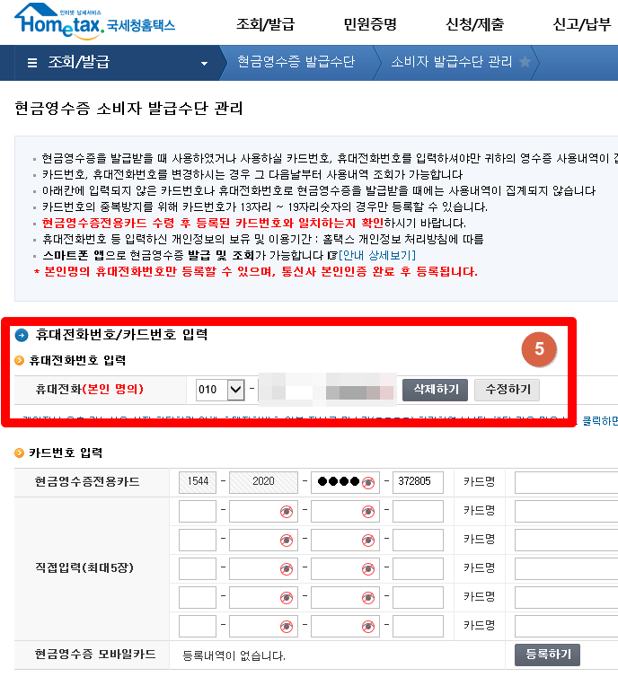 - [홈택스 홈페이지] - [조회/발급] - [현금영수증] - [소비자 발급수단 관리] - 전화번호 등록
