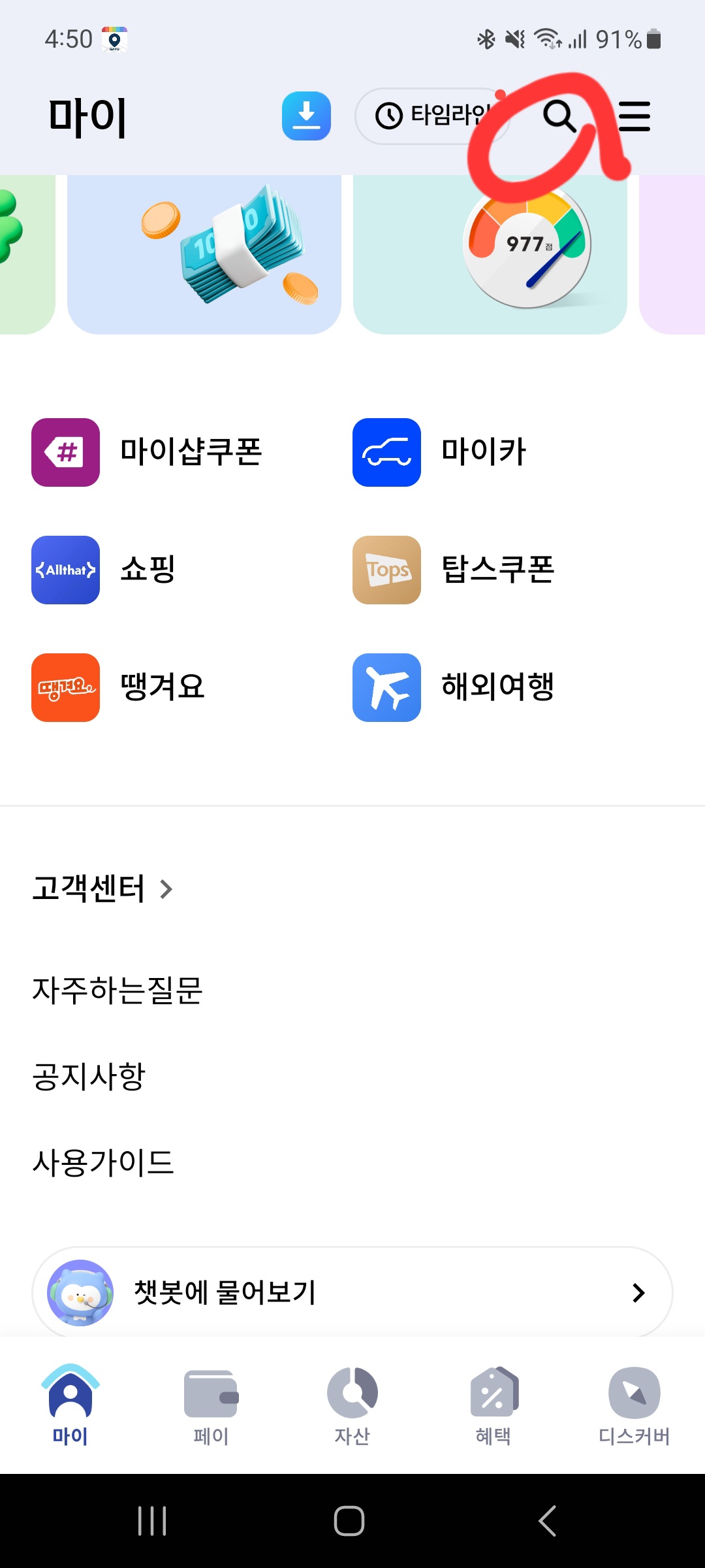 1. 신한카드 앱 다운로드 로그인 후 돋보기 클릭