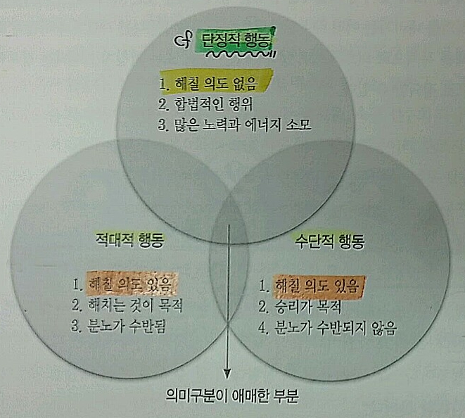 * 단정적 공격이란, 규칙에 의하여 허용되는 범위 내에서 합법적인 힘을 사용하는 것을 말한다. 이러한 행동은 합법적으로 허용되는 격렬한 행동이며, 과제지향적이고, 상대 선수를 해치려는 의도가 전혀 없이 단지 목적을 성취하기 위한 이례적인 노력일 뿐이다. 축구의 정면태클 등이 단정적 행동의 예이다. 단정적 행동 중에는 부상이 일어난다 할지라도 해칠 의도가 없었기 때문에 공격 행위라 할 수 없다.