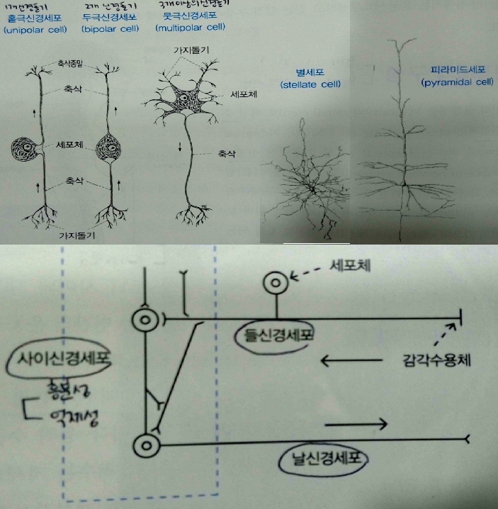 신경세포의 가지돌기 수에 따라 별세포, 피라미드세포로 나뉜다.