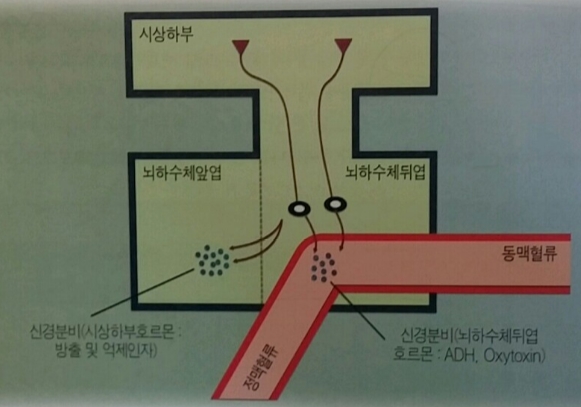 시상하부 - 하수체조절 : 자율신경계통에 의한 신경조절과 내분비샘에 의한 액성조절이 상호연계되어 있다