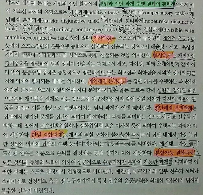 - 가산과제 : 개인적 운동수행 능력이 합산되어 집단의 수행능력으로 산출 (레슬링). 집단규모 클수록 유리
