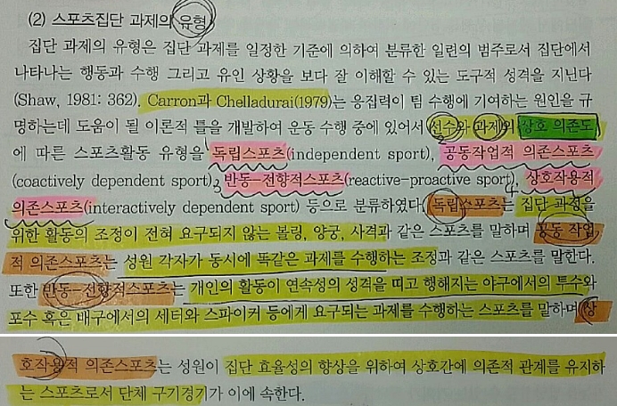 - 공동작업적 의존스포츠 : 성원 각자가 동시에 똑같은 과제를 수행하는 스포츠 (조정)
