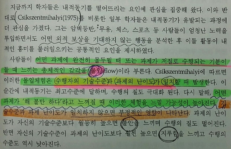 - 몰입 ( Flow) : 어떤 과제에 완전히 몰두될 때, 또는 과제가 저절로 수행되는 기분이 들대 느끼는 총제적인 감각