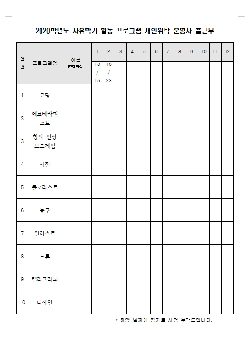 | 양식 : 방과후 및 동아리 출석부 양식 (xlsx) (0) | 2020.12.21 |
