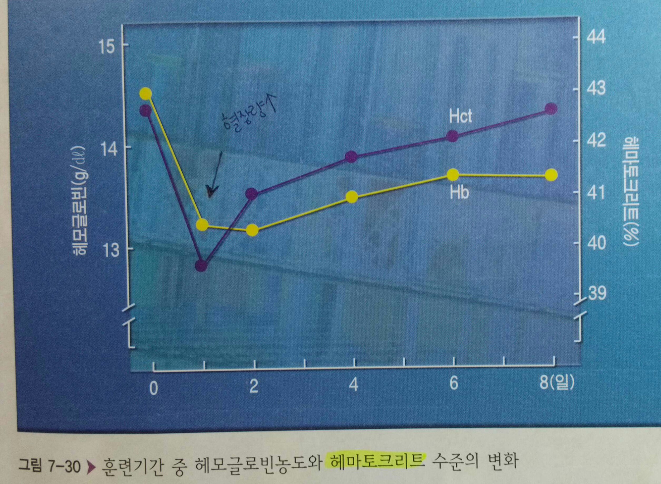 - 훈련초기 급격한 감소 이후 헤모글로빈과 헤마토크리스는 서서히 증가하는데 이때 혈장량의 증가폭이 상대적으로 더 크기 때문에 헤모글로빈 농도는 상대적으로 낮은 수준으로 머문다. (양이 작아지는게 아니란 이야기)