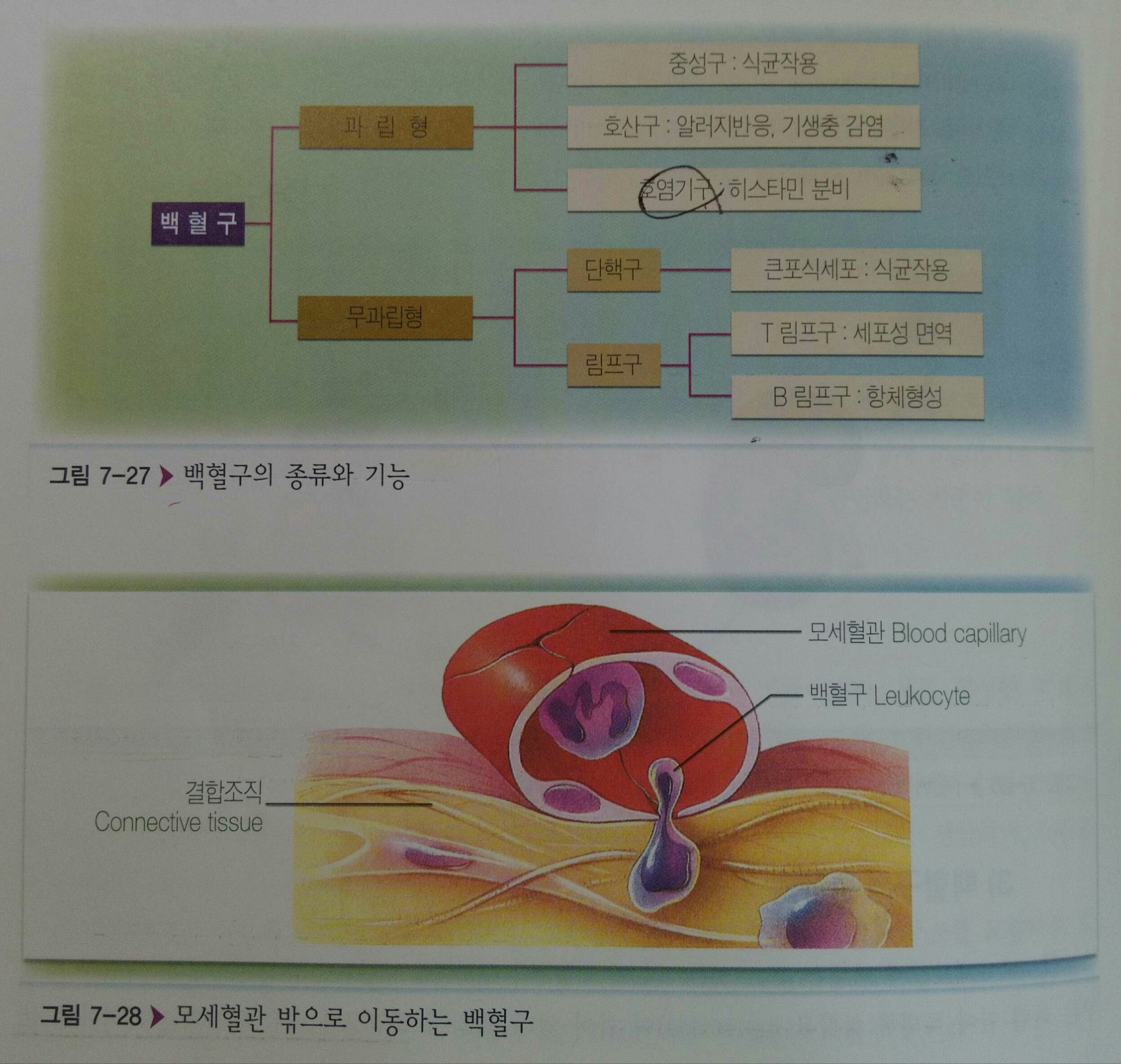 - 백혈구의 과립형 호염기구는 히스타민을 분비하여 손상부위의 혈류를 증가시키고 염증반응을 일으킨다.