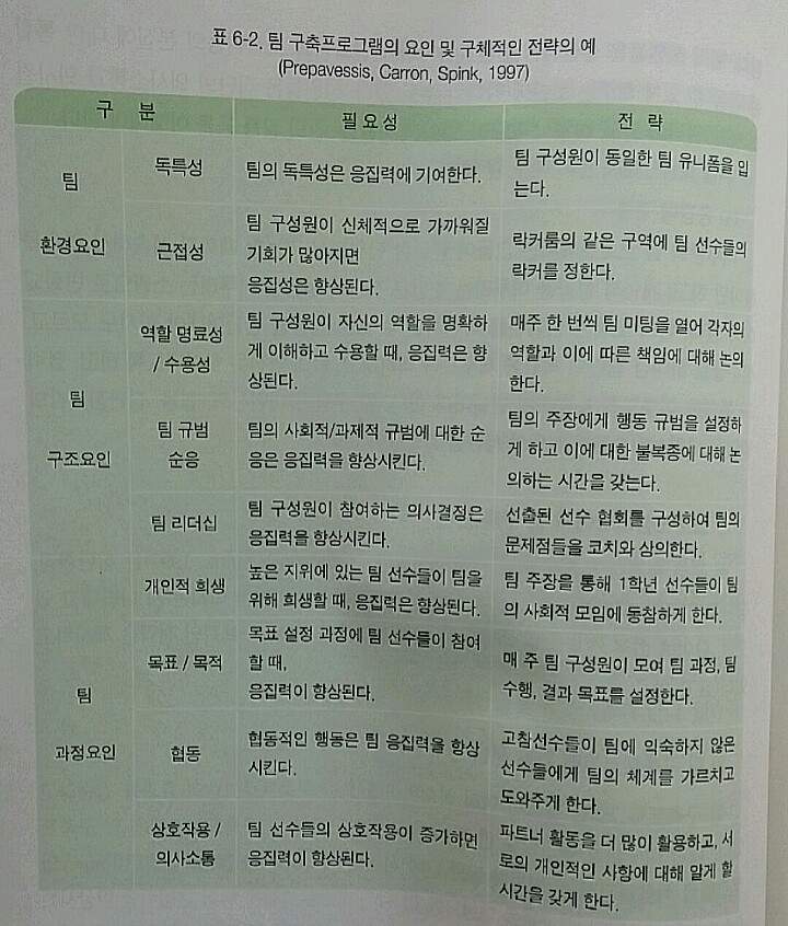 (1) 팀 분위기 발달의 기본적 요인 사회적 지지 : 정서적지지 > 평가지지, 정보제공. 선수들에게 정신적 신체적 안정감을 제공한다. 근접성 : 신체적 접촉, 태도의 유사성 특유성 : 다른 집단에 비