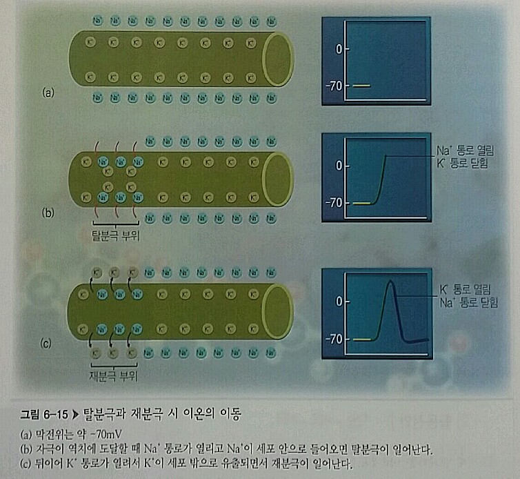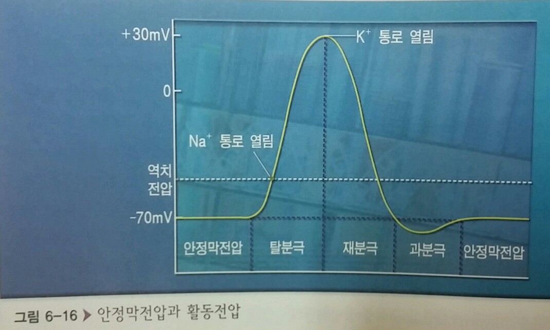 - 방아쇠구역 Na+통로 열림 → 탈분극 → 활동전압 30mV↑ → K+통로 열림 → 재분극 → 과분극