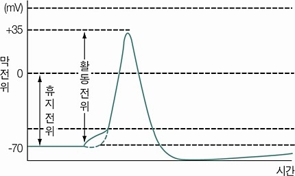 - 전위차 → 가중효과 → 역치전압 → 이온통로 열림 → 활동전압생성 (탈분극)