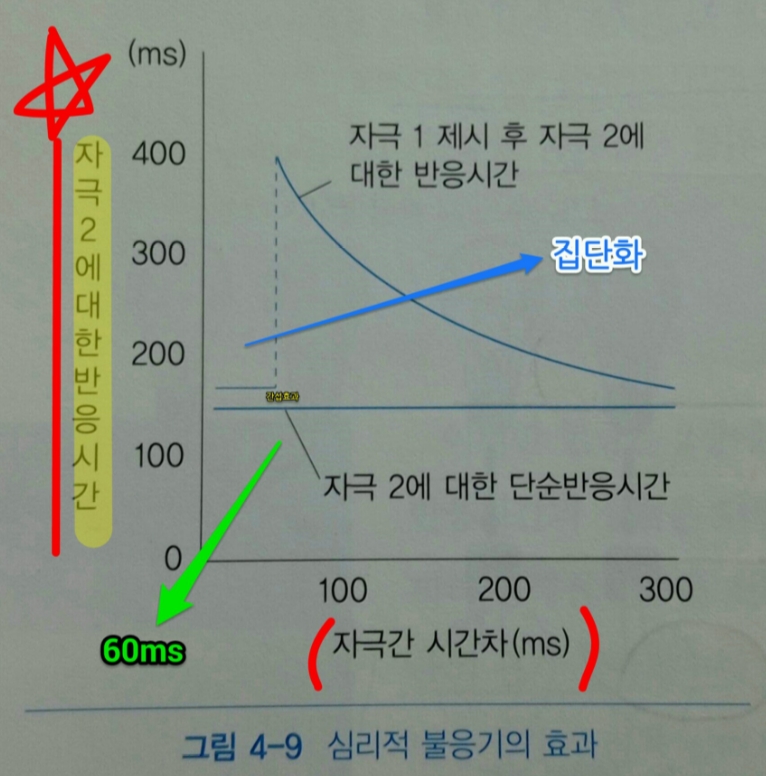 - 자극간 시간차가 짧으면 두번째 자극이 제시되었을 때 첫번째 자극에 대한 반응실행이 진행중에 있으므로 두번째 자극에 대한 반응실행이 지연되는 심리적 불응기가 발생한다.