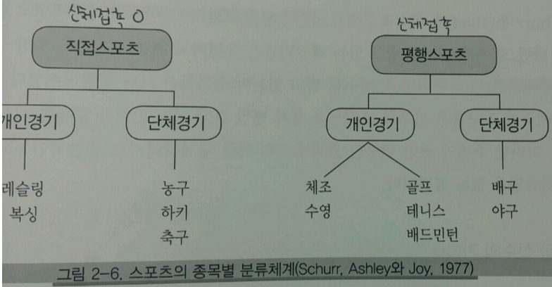 - 스포츠는 신체접촉 여부에 따라 직접스포츠와 평행 스포츠로 구분한다.